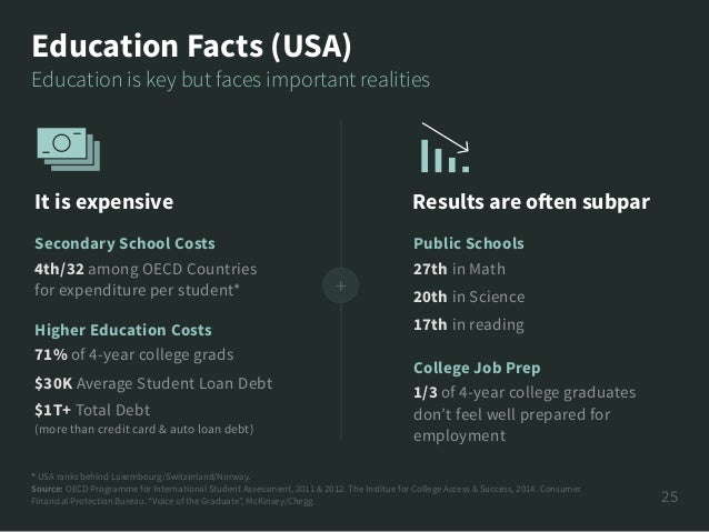 - 11. * USA ranks behind Luxembourg/Switzerland/Norway. Source: OECD Programme for International Student Assessment, 2011 & 2012. The Institue for College Access & Success, 2014. Consumer Financial Protection Bureau. “Voice of the Graduate”, McKinsey/Chegg. 25 Education Facts (USA) It is expensive Secondary School Costs 4th/32 among OECD Countries for expenditure per student* 71% of 4-year college grads $30K Average Student Loan Debt $1T+ Total Debt (more than credit card & auto loan debt) Results are often subpar Higher Education Costs Public Schools 27th in Math 20th in Science 17th in reading College Job Prep 1/3 of 4-year college graduates don’t feel well prepared for employment Education is key but faces important realities +