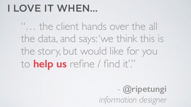 - 67. “… the client hands over the all the data, and says: ‘we think this is the story, but would like for you to help us refine / find it’.” ! ! - @ripetungi information designer I LOVE IT WHEN…