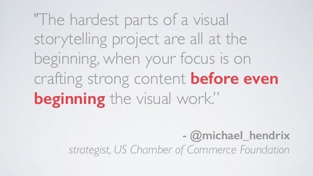 - 69. "The hardest parts of a visual storytelling project are all at the beginning, when your focus is on crafting strong content before even beginning the visual work.” ! - @michael_hendrix strategist, US Chamber of Commerce Foundation