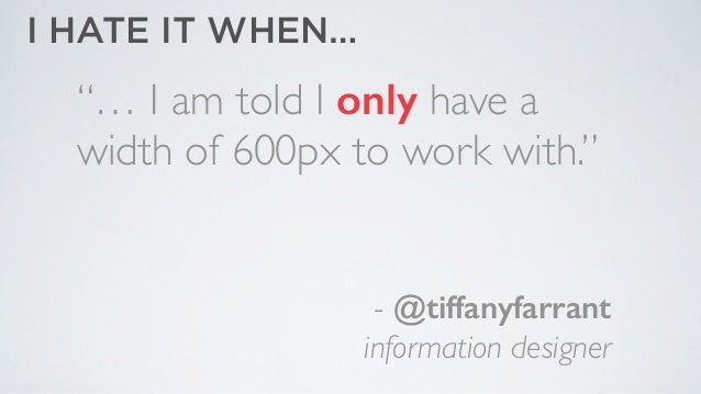 - 79. “… I am told I only have a width of 600px to work with.” ! ! ! - @tiffanyfarrant information designer I HATE IT WHEN…