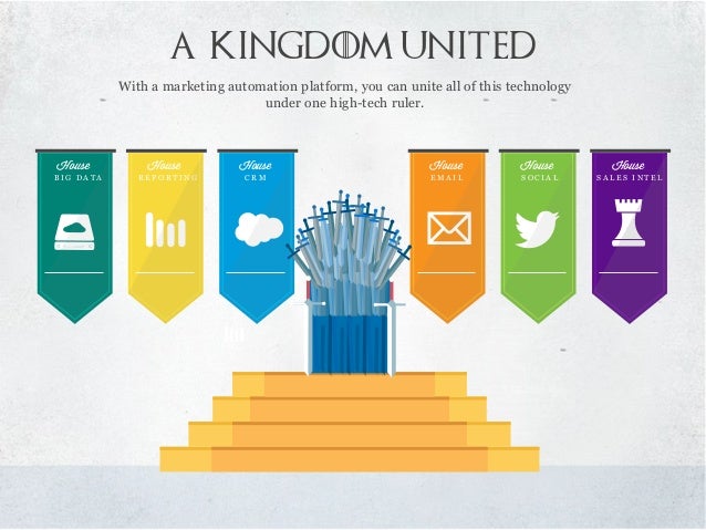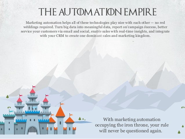 - 12. Marketing automation helps all of these technologies play nice with each other — no red weddings required. Turn big data into meaningful data, report on campaign success, better service your customers via email and social, enable sales with real-time insights, and integrate with your CRM to create one dominant sales and marketing kingdom. THE AUTOMATION EMPIRE AND CRUSH THEM With marketing automation occupying the iron throne, your rule will never be questioned again.