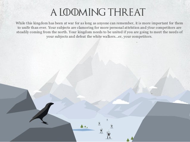 - 4. AND CRUSH THEM A LOOMING THREAT While this kingdom has been at war for as long as anyone can remember, it is more important for them to unite than ever. Your subjects are clamoring for more personal attention and your competitors are steadily coming from the north. Your kingdom needs to be united if you are going to meet the needs of your subjects and defeat the white walkers...er, your competitors.