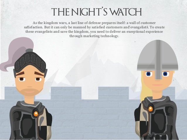 - 5. AND CRUSH THEM THE NIGHT S WATCH As the kingdom wars, a last line of defense prepares itself: a wall of customer satisfaction. But it can only be manned by satisfied customers and evangelists. To create these evangelists and save the kingdom, you need to deliver an exceptional experience through marketing technology.