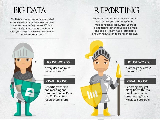 - 7. BIG DATA Rival House: Big Data’s rise to power has provided more valuable data than ever for your sales and marketing teams. With so much insight into every touchpoint with your buyers, why would you ever need another tool? “Every decision must be data-driven.” Reporting wants to find meaning and trends within Big Data, but Big Data often resists these efforts. Reporting Reporting and Analytics has earned its spot as a dominant house in the marketing landscape. After years of being tied to other houses like email and social, it now has a formidable enough reputation to stand on its own. HOUSE WORDS: RIVAL HOUSE: Rival House: “Campaign Success? It is known.” Reporting may get along fine with Email, but it has a harder time getting Social Media to cooperate. HOUSE WORDS: RIVAL HOUSE: