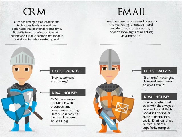 - 8. CRM CRM has emerged as a leader in the technology landscape, and has dominated that position for some time. Its ability to manage interactions with current and future customers has made it a vital tool for sales, marketing, and EMAIL Email has been a consistent player in the marketing landscape — and despite rumors of its decline, it doesn’t show signs of relenting anytime soon. Rival House: “New customers are coming.” CRM tracks every interaction with prospects and customers — but Big Data sure is making that hard by being so...well, big. HOUSE WORDS: RIVAL HOUSE: “If an email never gets delivered, was it ever an email at all?” Email is constantly at odds with the always-on nature of Social. With Social still finding its place in the business world, Email can’t help but feel a bit of a superiority complex. HOUSE WORDS: RIVAL HOUSE: