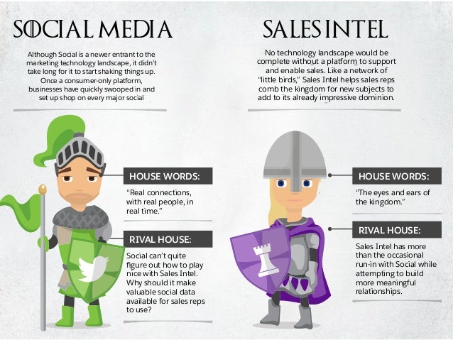 - 9. SOCIAL MEDIA Although Social is a newer entrant to the marketing technology landscape, it didn’t take long for it to start shaking things up. Once a consumer-only platform, businesses have quickly swooped in and set up shop on every major social SALES INTEL No technology landscape would be complete without a platform to support and enable sales. Like a network of “little birds,” Sales Intel helps sales reps comb the kingdom for new subjects to add to its already impressive dominion. “Real connections, with real people, in real time.” Social can’t quite figure out how to play nice with Sales Intel. Why should it make valuable social data available for sales reps to use? HOUSE WORDS: RIVAL HOUSE: Rival House: “The eyes and ears of the kingdom.” Sales Intel has more than the occasional run-in with Social while attempting to build more meaningful relationships. HOUSE WORDS: RIVAL HOUSE: